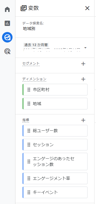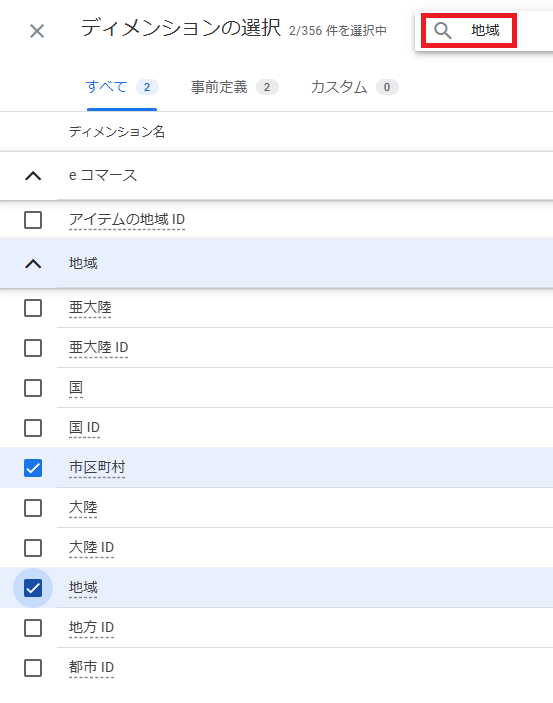 変数エリアにある「ディメンション」横の+をクリックすると,ディメンションの選択画面が表示されます。地域別のデータを見たいので,「地域」と入力して検索します。