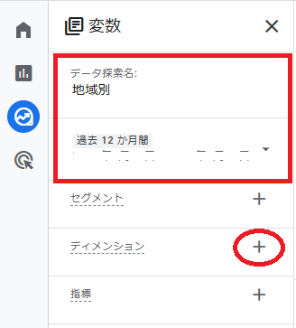 次は,ディメンションと指標の設定です。変数エリアにある「ディメンション」横の+をクリックします。