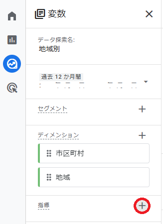 次は,指標の設定です。変数エリアの「指標」横の+をクリックします。