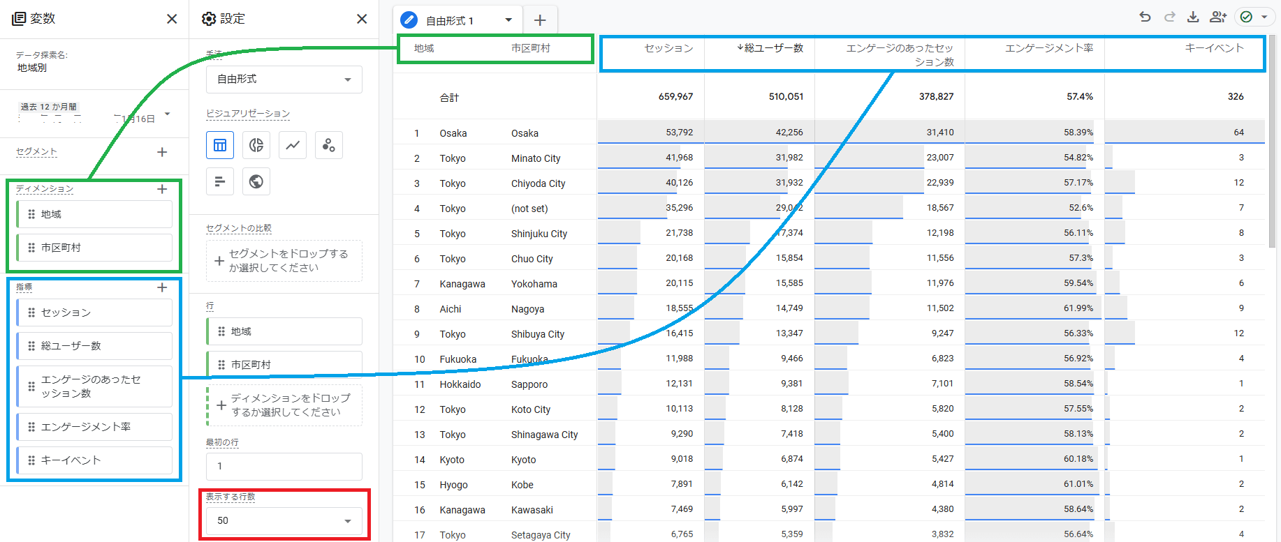 それぞれの項目を,変数エリアから設定エリアへドラッグ&ドロップします。ディメンションは「行」へ,指標は「値」へ設定します。