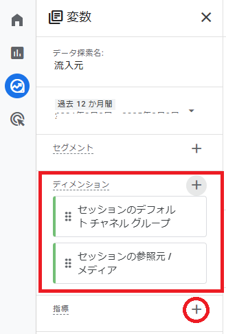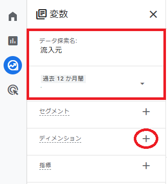 次にディメンションを設定していきます。+ マーク(画像赤丸囲み部分)をクリックします。