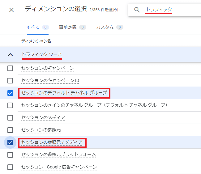 「ディメンションの選択」画面で「トラフィック」と検索します。今回は,以下の2つを使います。