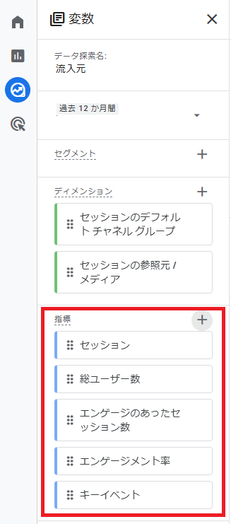 「指標をドロップするか選択してください」の部分をクリックすると,変数エリアで設定した指標がリスト表示されます。そこから選択してもOKです。たくさんの指標を設定する場合は,こちらのほうが速いかもしれません。