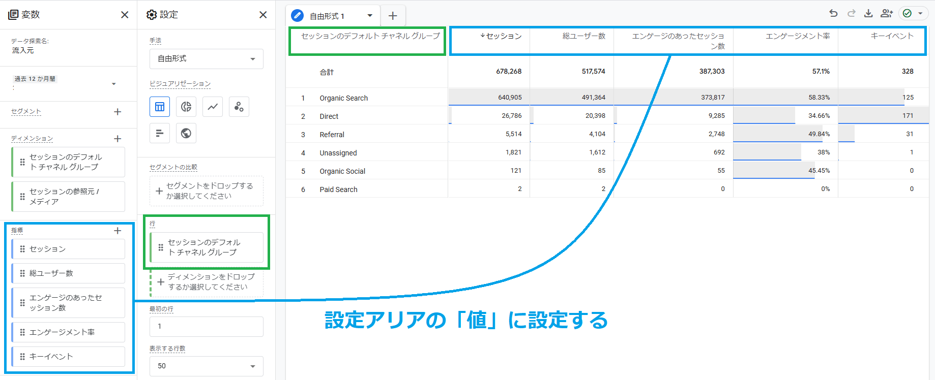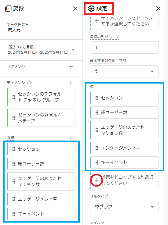 設定エリアで,まずは「行」に「セッションのデフォルトチャネルグループ」を設定します。ドラック&ドロップで設定できます。「値」の部分には「指標」で登録した5つすべてを設定してください。