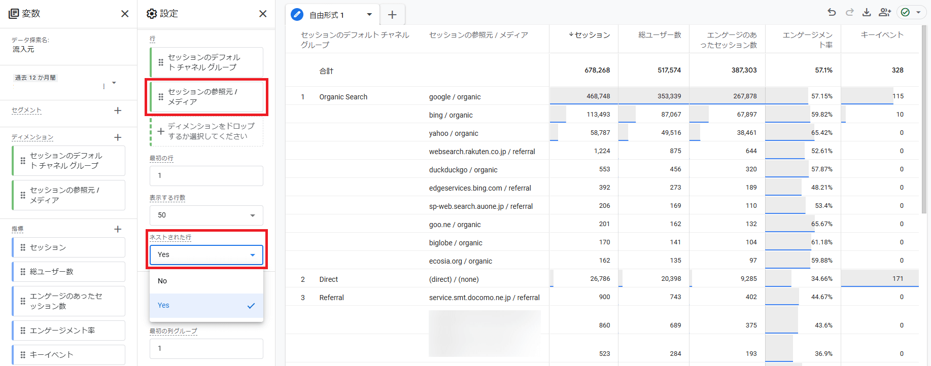 「行」に「セッションの参照元/メディア」を設定してみましょう。「ネストされた行」は,「Yes」にして,ネスト(入れ子)表示します。こうすることで,より詳細な情報が得られます。