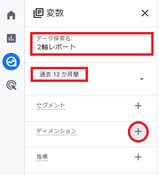 次にディメンションと指標を設定します。「ディメンション」横にある + マークをクリックします。
