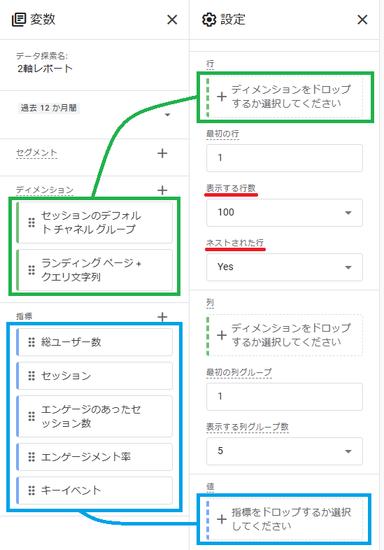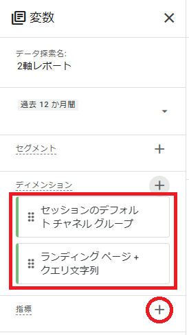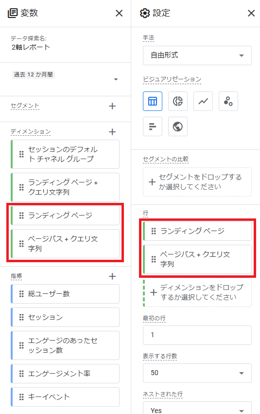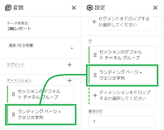 今度は「ランディングページ + クエリ文字」× 「ページパス + クエリ文字」の2軸にしてみます。これまでの2つを「行」から削除して,新たに「ランディングページ + クエリ文字」× 「ページパス + クエリ文字」を変数エリアで登録し,設定エリアに設定してください。