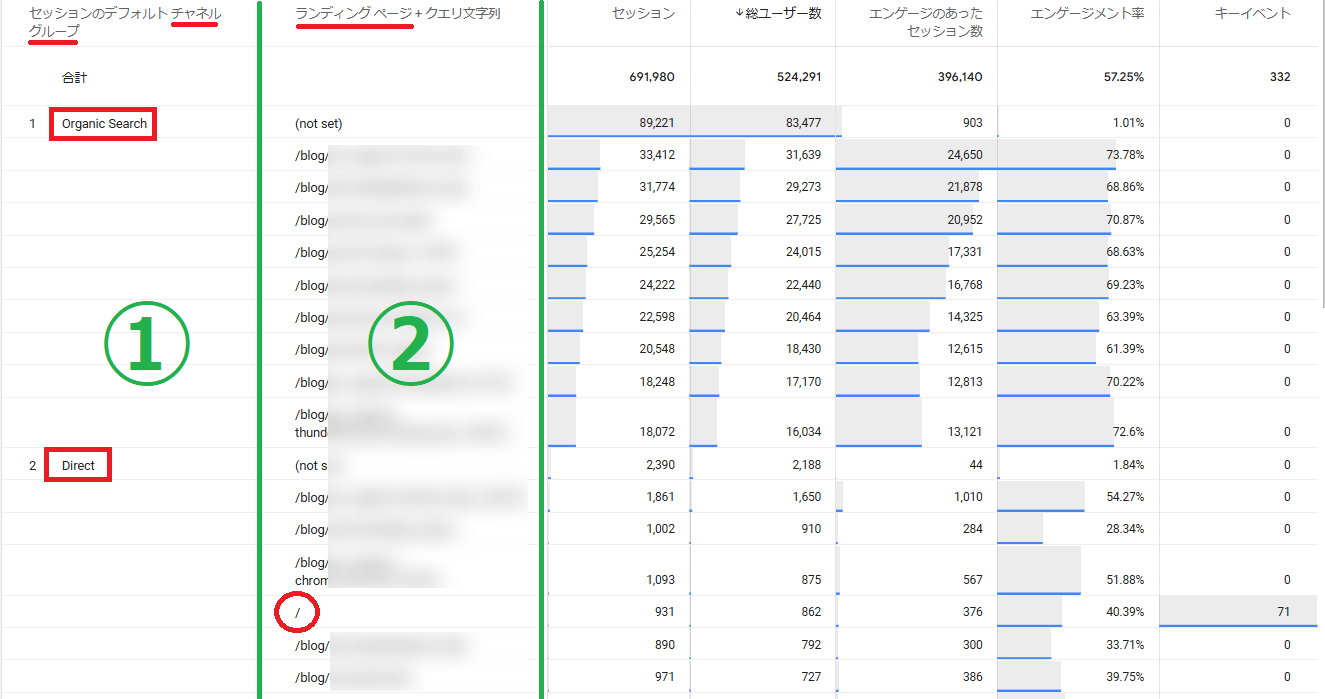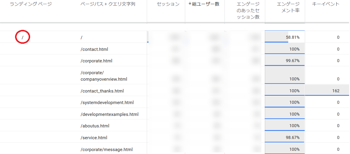 「Direct」(ブックマークなどのURL)からは,「/」つまりトップページへの流入があり,ここからコンバージョン(キーイベント)が生じていることも分かります。いったんブックマークして検討した上での問い合わせ(キーイベント)に至っているようです。