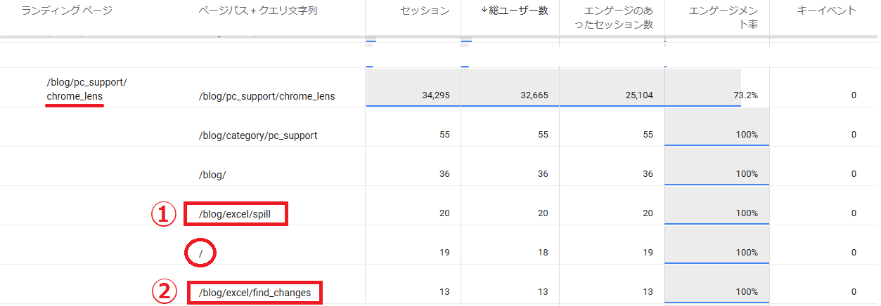 ランディングからのページ遷移の多くが,階層を上がってカテゴリー(/pc-support),やブログ一覧(/blog)やトップページ(/)に行っていることが分かりますが,特定のブログ記事に遷移していることも分かります。画像の①②です。なぜ,この2つのページへ遷移しているのでしょうか。