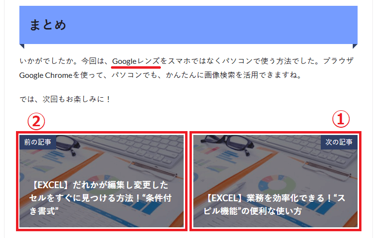 上の画像は当社の該当ページです。ページ下部には,ブログの「まとめ」の後に前後のブログ記事を紹介するコンテンツが設置されています。この部分から①②のページへ遷移しているようです。