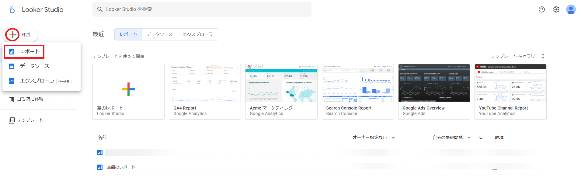 まずは,テンプレートは使わずにGA4のデータと接続してみましょう。左上表示されている「+ 作成」をクリックし,「レポート」を選択してください。
