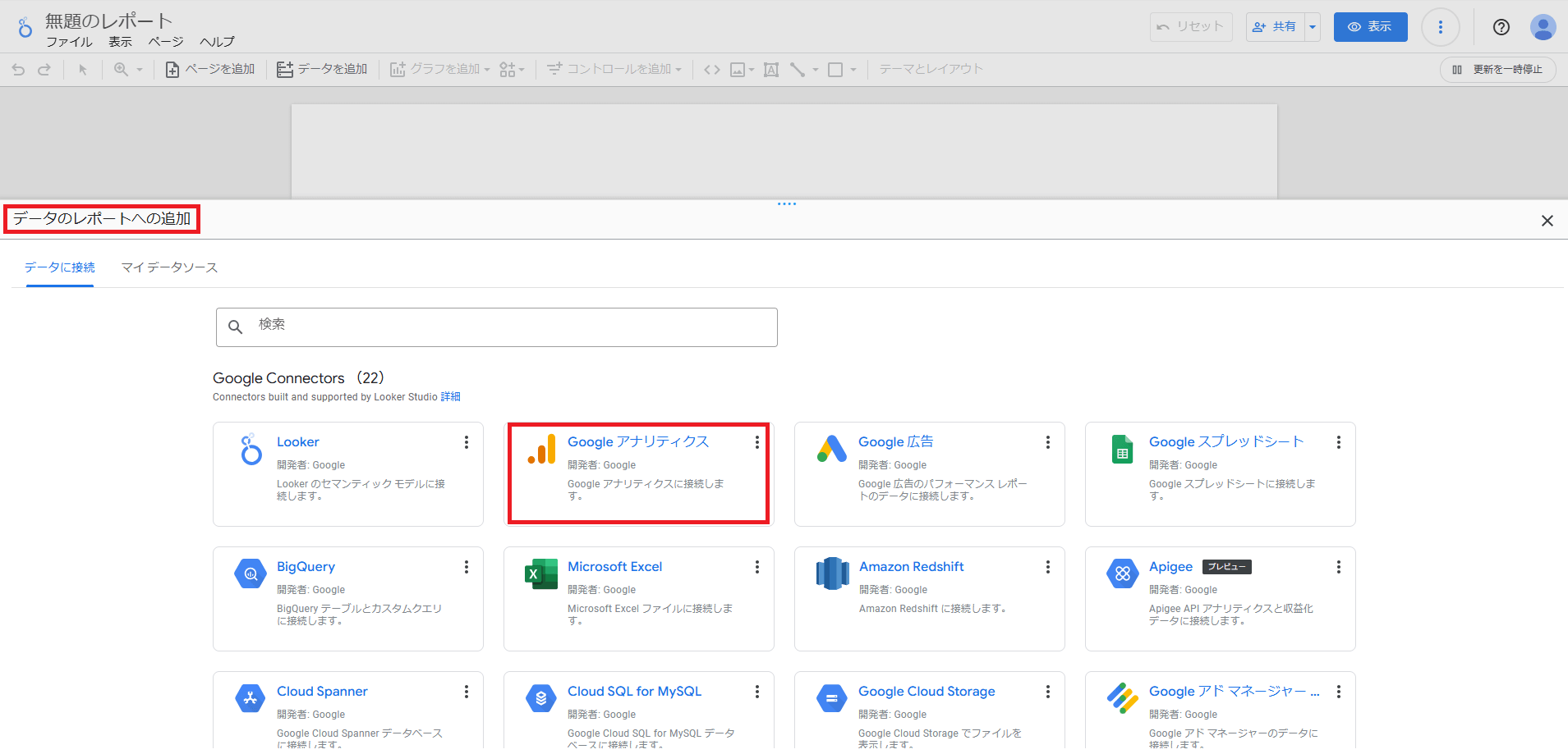 「データのレポートへの追加」が開きます。上部には,Google提供のサービスが並んでいます。