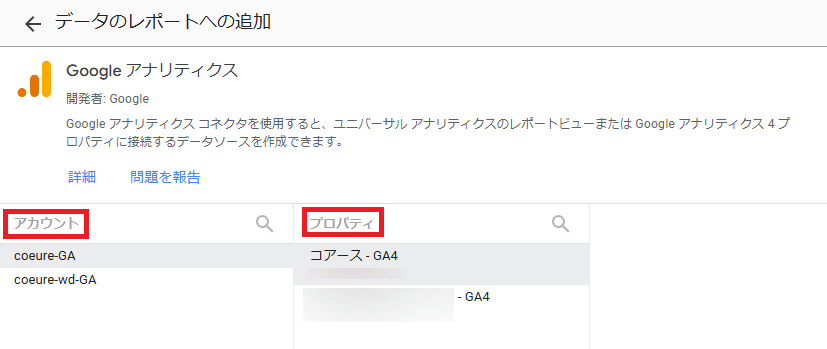 ここでは,「アカウント」と「プロパティ」を選択します。Googleアナリティクスに登録されているアカウントとプロパティが表示されますので,データ接続したいものを選びます。最後に右下の「追加」をクリックします。