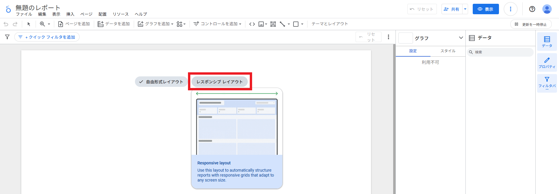 「自由形式レイアウト」と「レスポンシブレイアウト」のどちらかを選択します。好みもありますが,レスポンシブにしておくと便利です。
