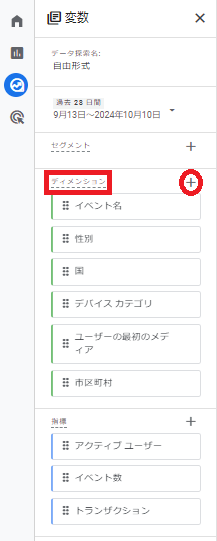 まずは「ディメンション」です。すでに「イベント名」「性別」など6つの項目が設定されていますが,追加するため右横にある+をクリックしましょう。