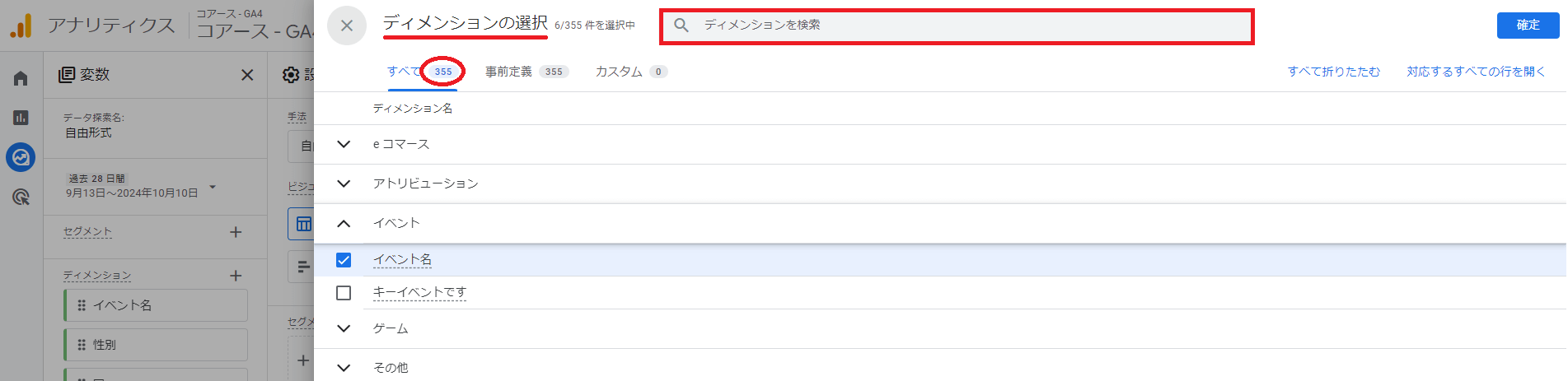 画像の通り,ディメンションの種類は執筆時点で「355」種類もあります。そのため項目を検索して探します。
