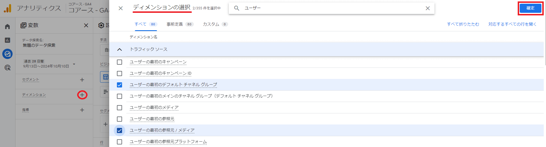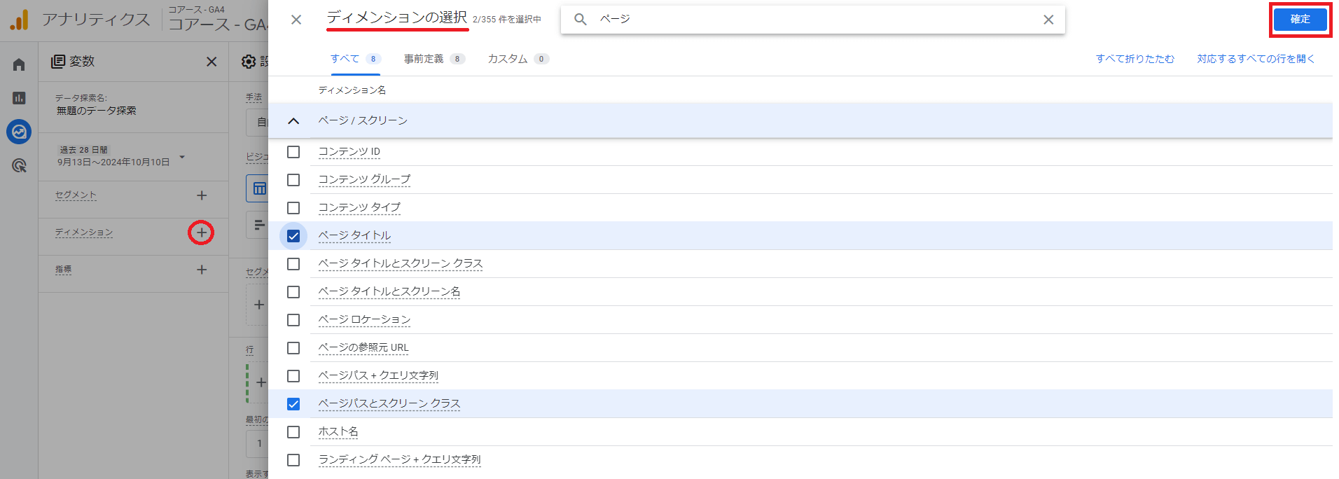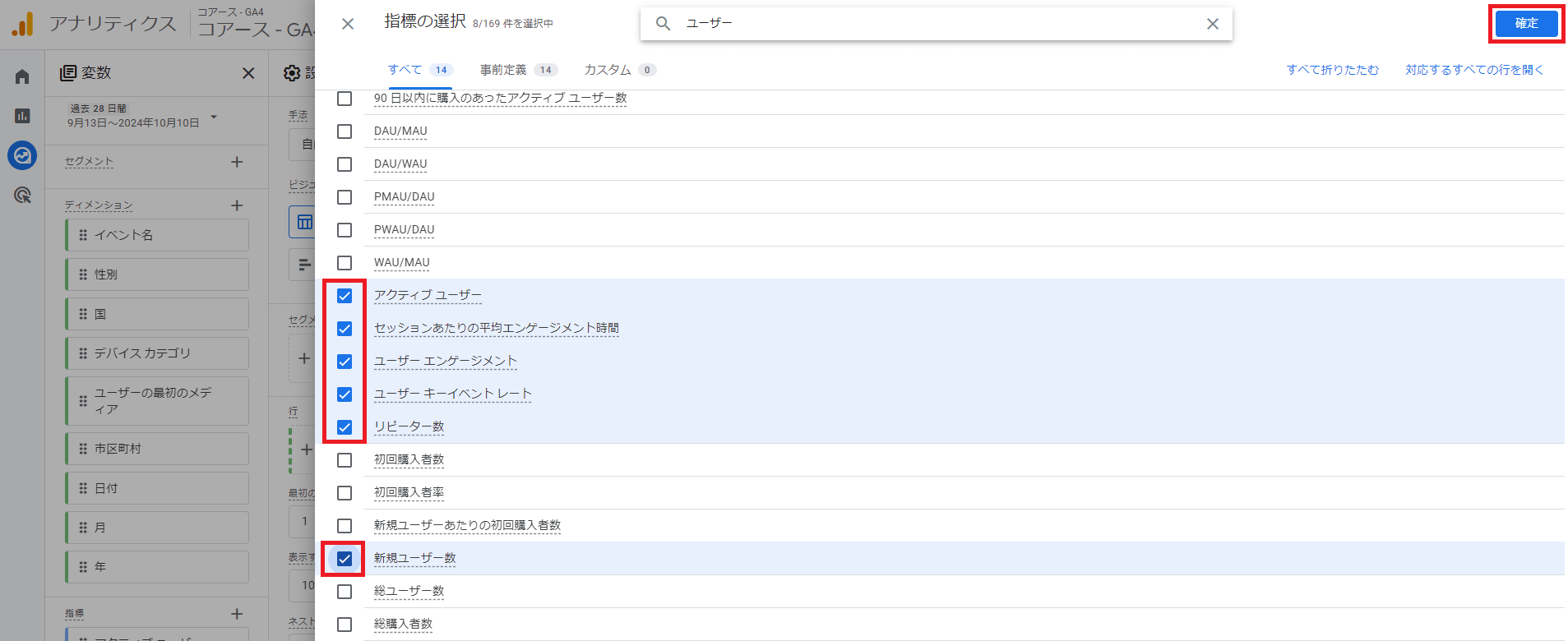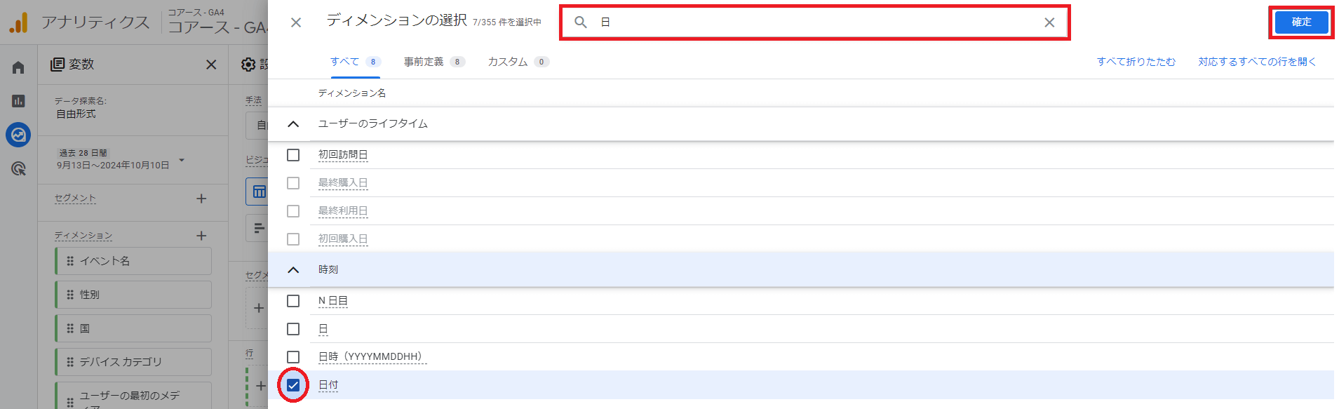今回は「日別のユーザー情報」を得たいので,検索窓に「日」と入れます。関連するディメンションが出てくるので「日付」にチェックを入れましょう。最後に右上の「確定」をクリックします。