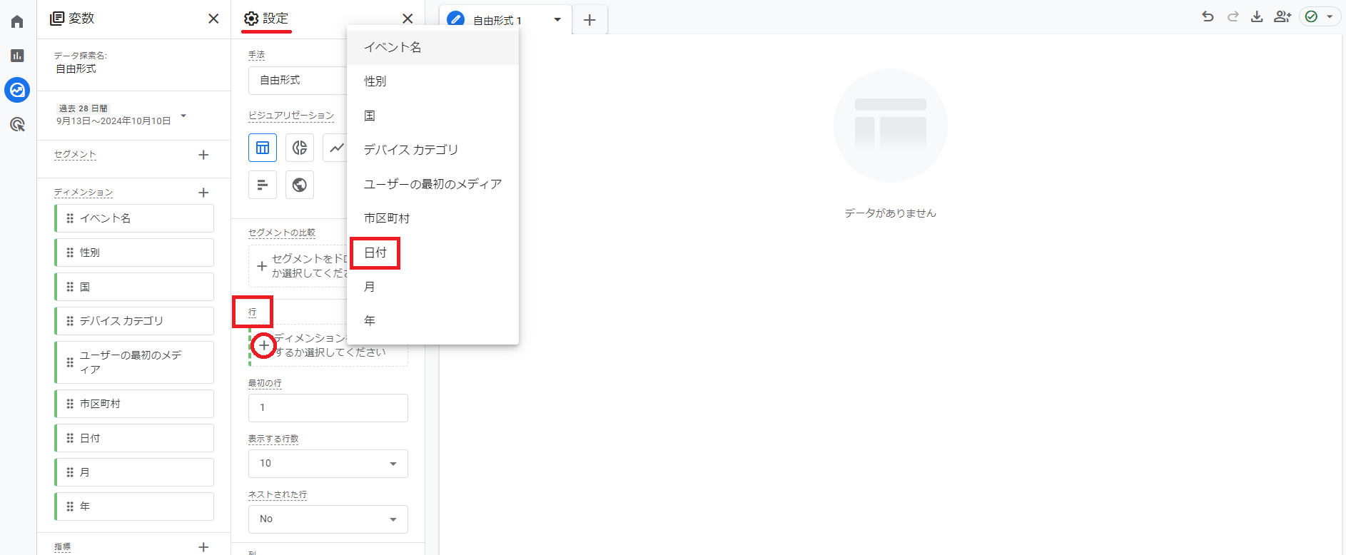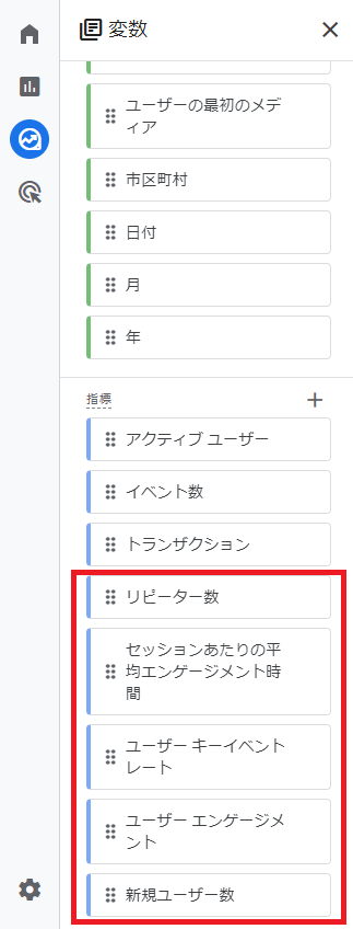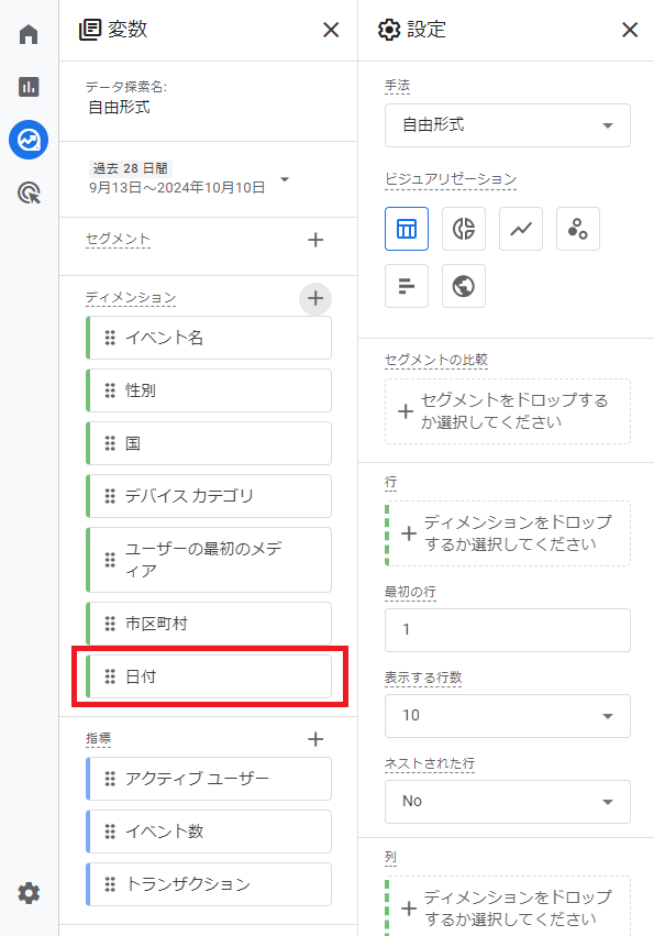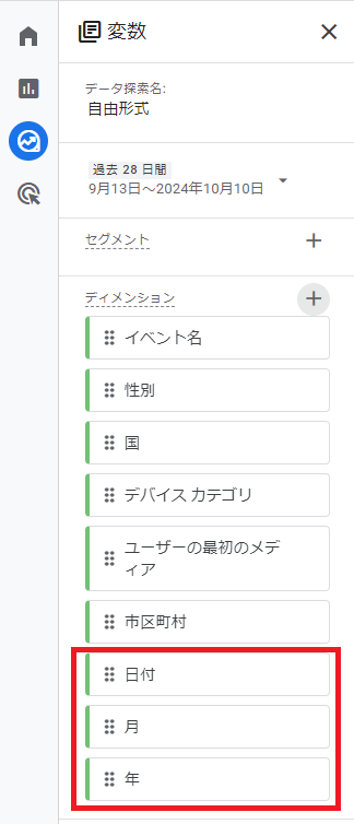 こうすることで,変数エリアのディメンションの部分に「日付」の項目が追加されました。