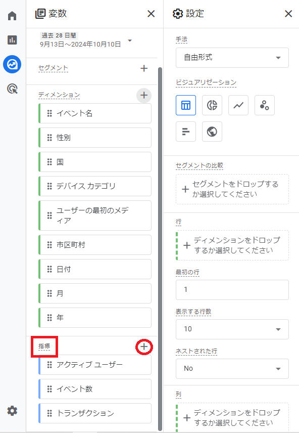 変数エリアの「指標」が”列”にあたる項目です。横にある + をクリックします。