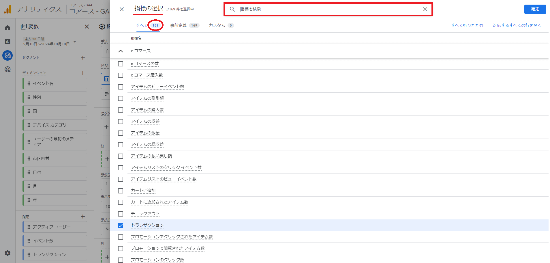 「指標の選択」画面に遷移します。これまた「169」種類もあります。検索して必要な項目を選択します。