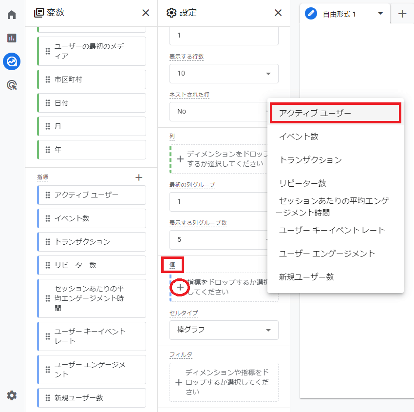 まずは「アクティブユーザー」を設定します。同じ要領で,他の”列”も設定します。