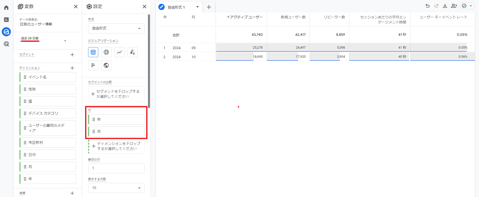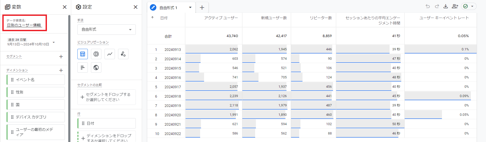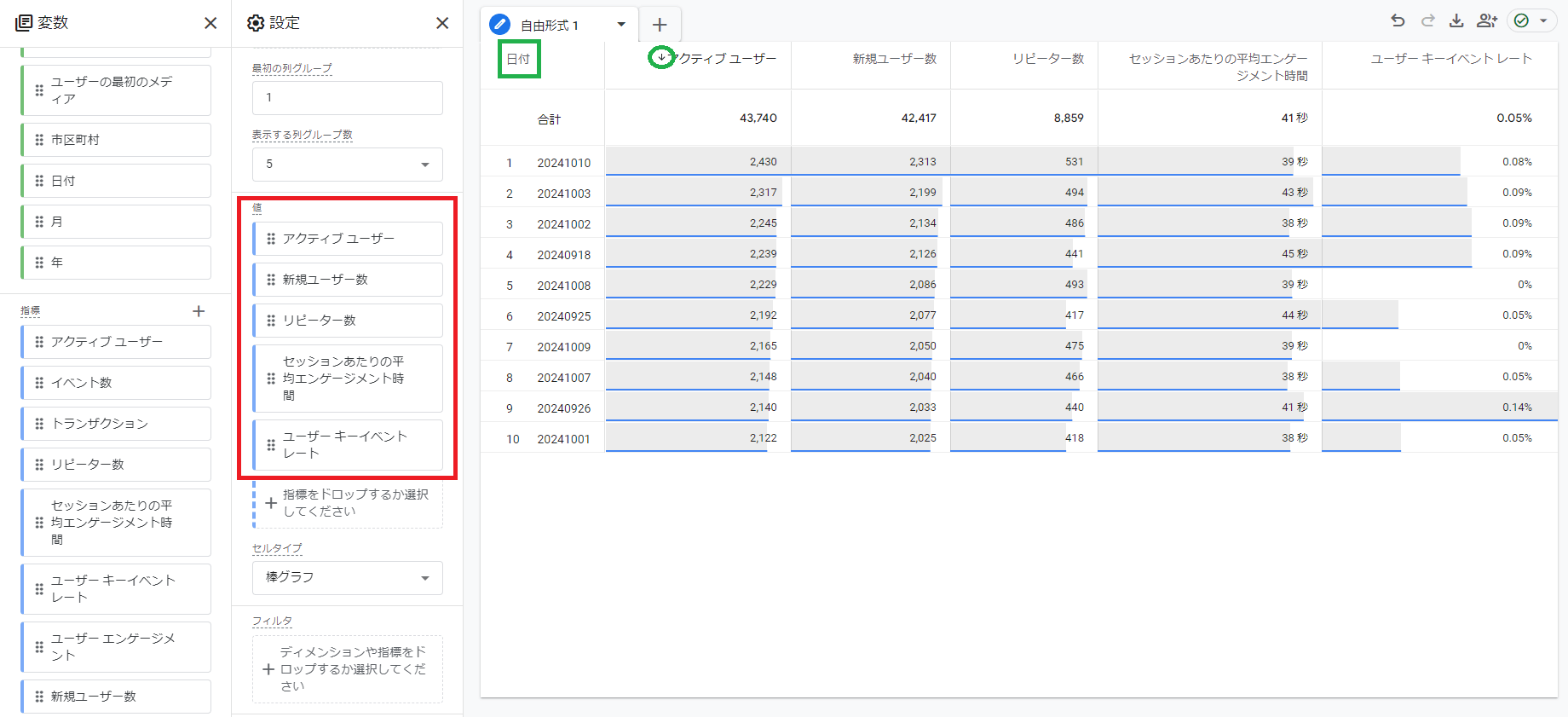引き続き,「自由形式」を使います。先程の「日別のユーザー情報」を流用しています。
