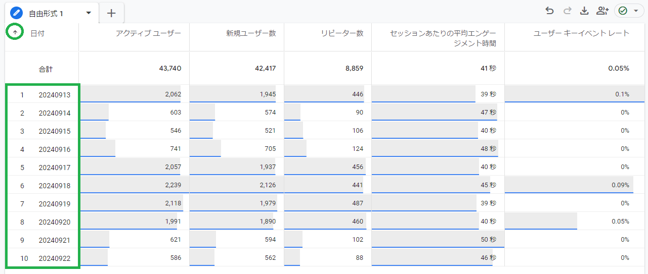 現在はアクティブユーザー数順で表示されています,日付で並び替えたい場合は,見出し「日付」(緑囲み部分)をクリックしてください。