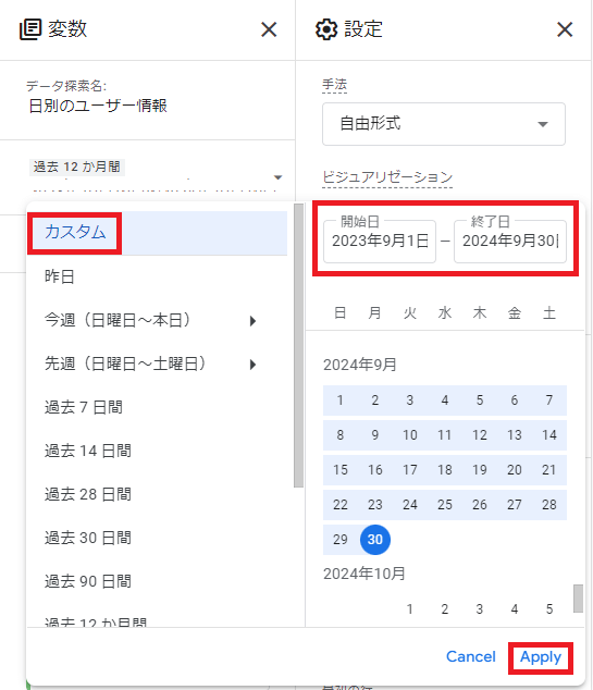 「開始日」と「終了日」を設定します。今回は2023年9月~2024年9月までの13ヶ月を指定しました。最後に「Apply」て適用させます。