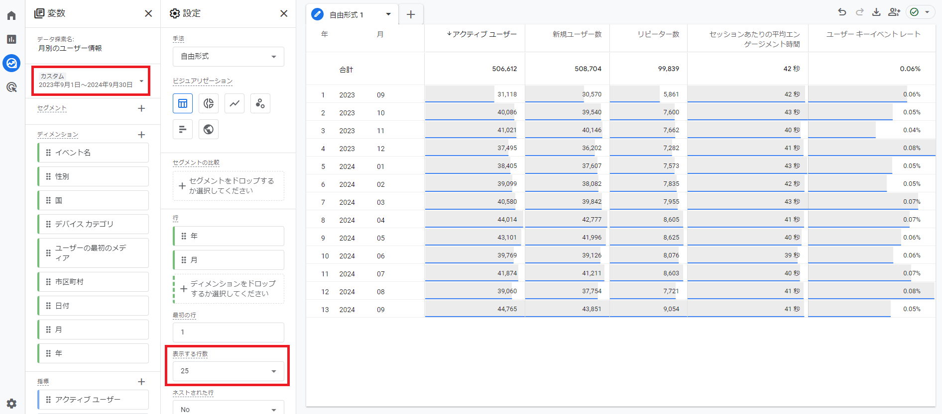 設定エリアの「表示する行数」を25に設定すれば,表示エリアにはカスタムで設定した13か月分のデータすべてが表示されます。