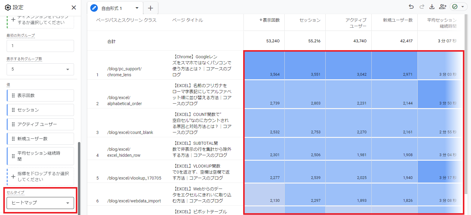 設定エリアの下部に「セルタイプ」を選択できるところがあります。ここを「ヒートマップ」にすると,上の画像のような表示のレポートが作成できます。量的に多いところが色が濃くなっていますね。