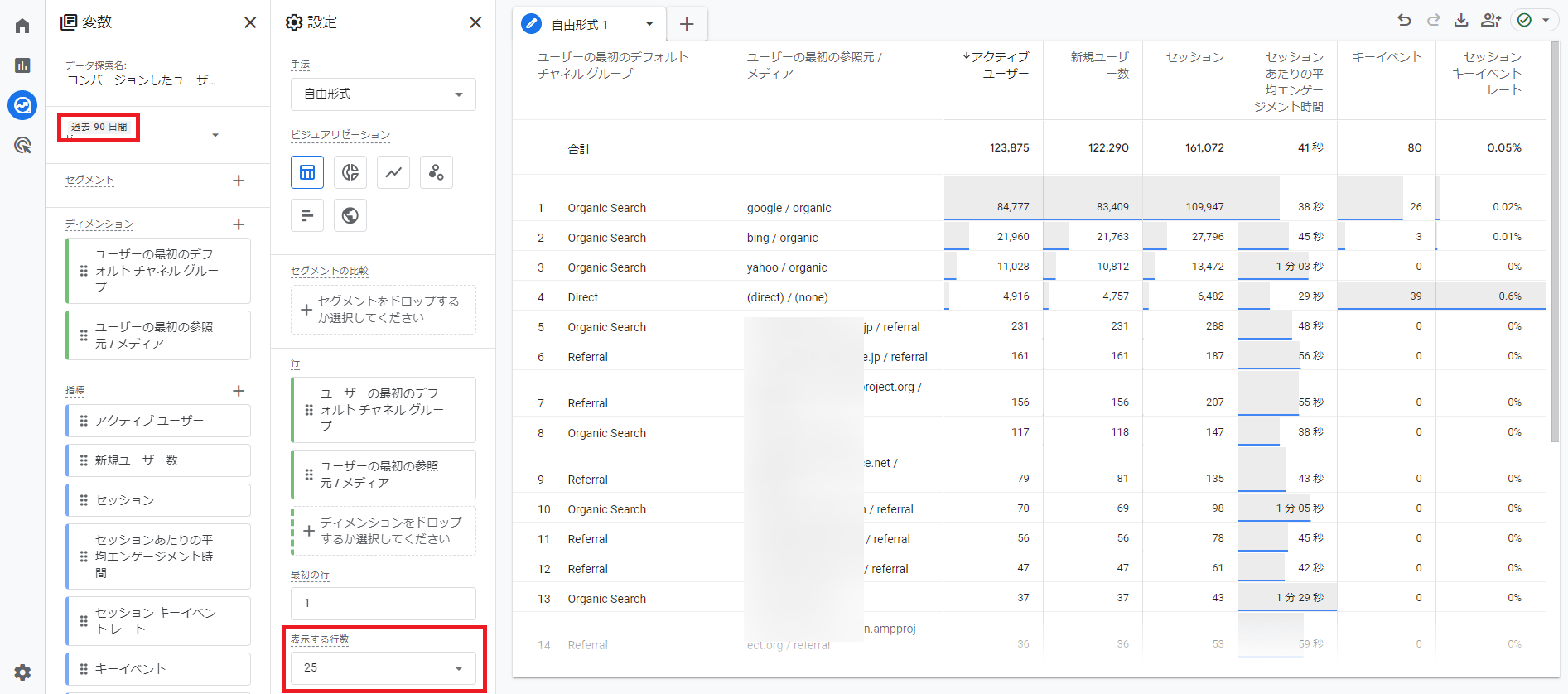設定エリアにそれぞれを設定して,表示させています。期間は「過去90日間」,表示する行は「25」です。
