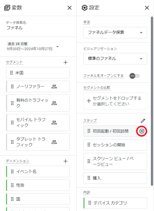 デフォルトでは,「初期起動/初回訪問」→「セッションの開始」→「スクリーンビュー/ページビュー」→「購入」までのステップが設定されて,「内訳」としてデバイスカテゴリごとのデータも表示されています。