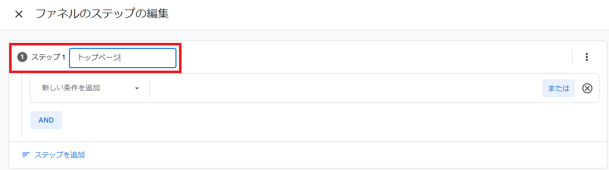それぞれのステップにステップ名が設定できます。分かりやすいものなら何でもOKです。今回ステップ1は「トップページ」にしてみました。