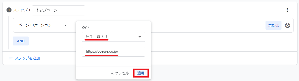 「条件」として,上段に「完全一致」を,下段にトップページのURLを設定します。最後に「適用」をクリックしてください。