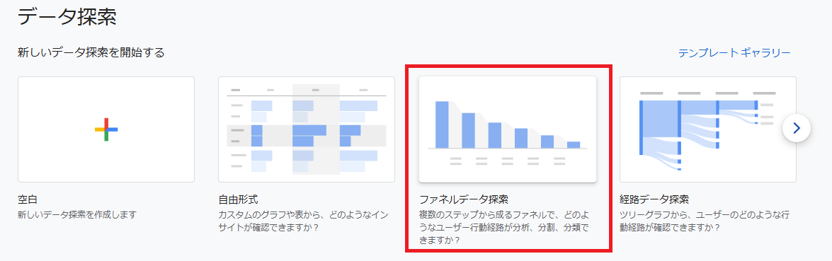 テンプレートギャラリーから「ファネルデータ探索」を選択します。