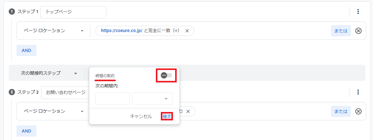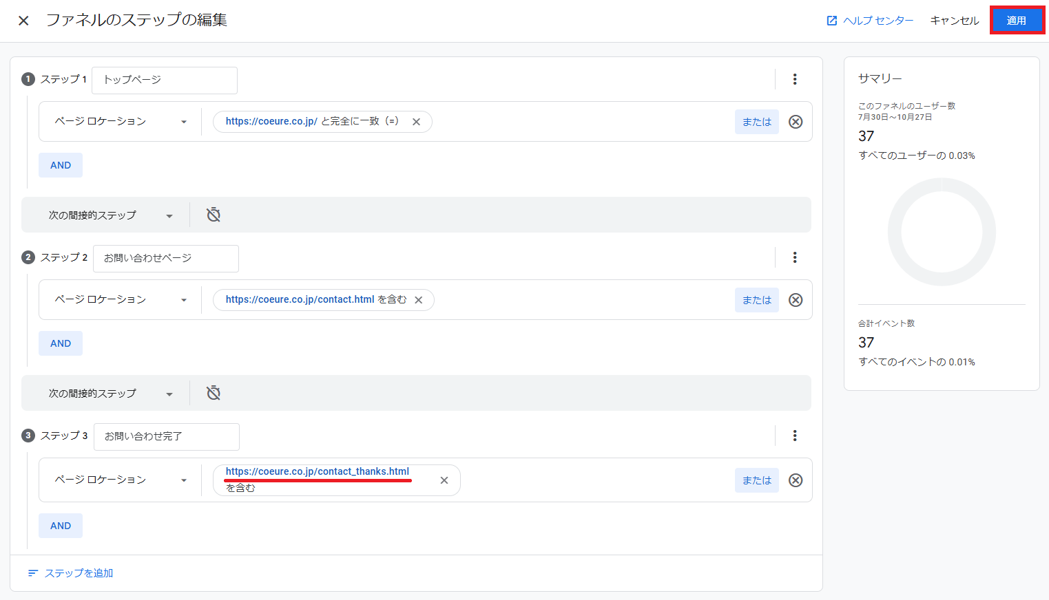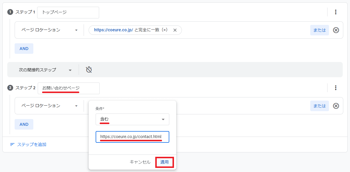 ステップ2は,「お問い合わせページ」というステップ名にしました。条件は,「ページロケーション」で問い合わせページのURLを「含む」で設定しています。最後に「適用」です。
