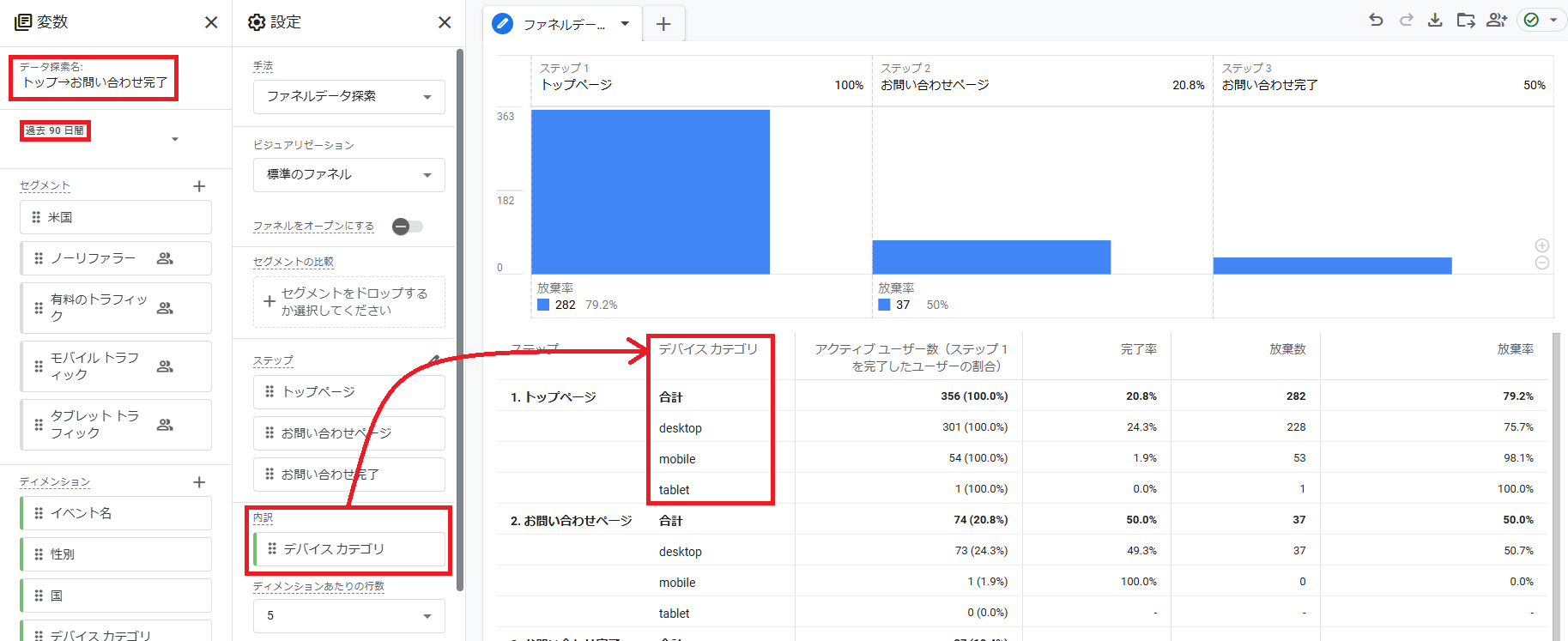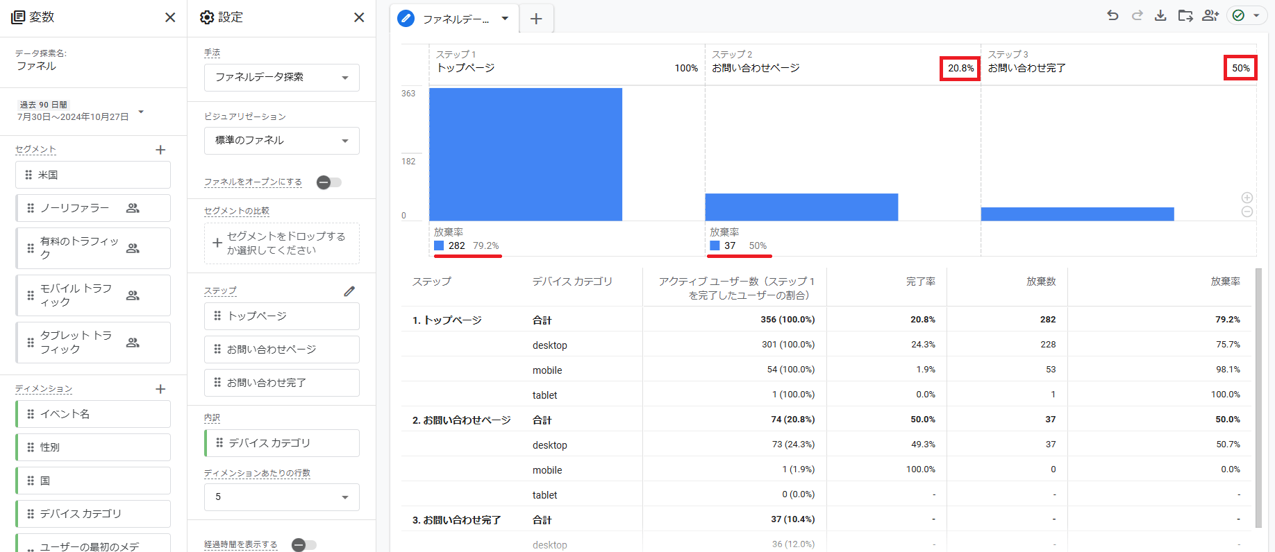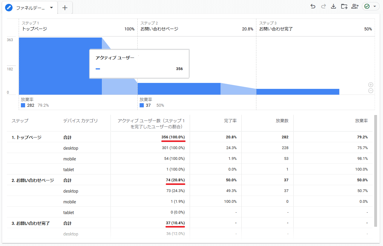 トップページ→お問い合わせページまでは20.8%のユーザーが遷移していること,お問い合わせページ→問い合わせ完了までは50%のユーザーが到達していることが分かりますね。
