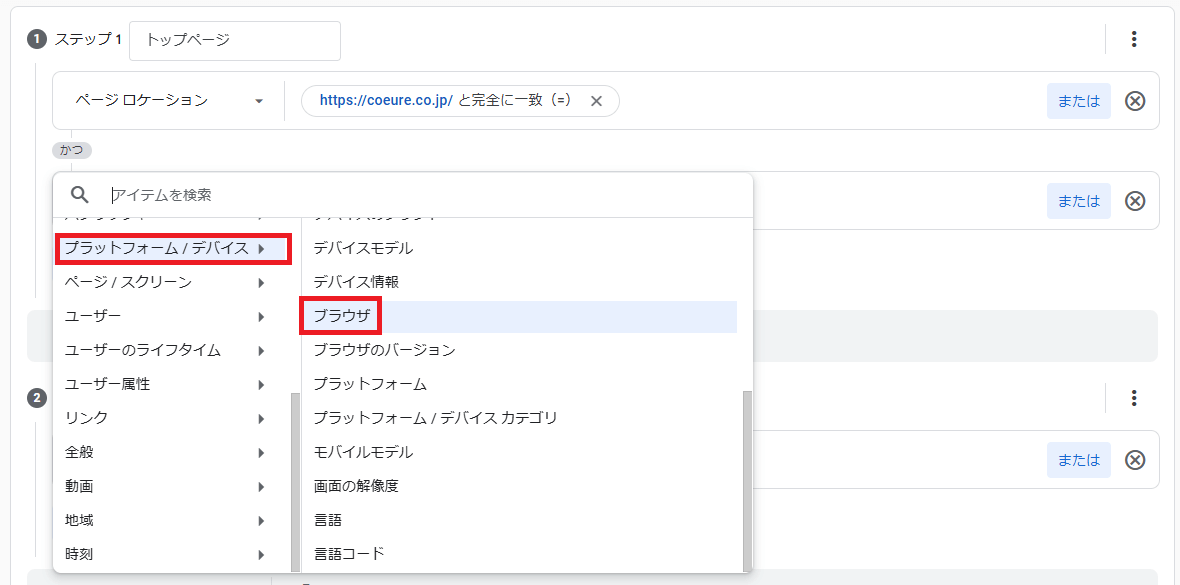 ここでは,使用したブラウザを条件に加えてみましょう。「プラットフォーム/デバイス」>「ブラウザ」を選択します。