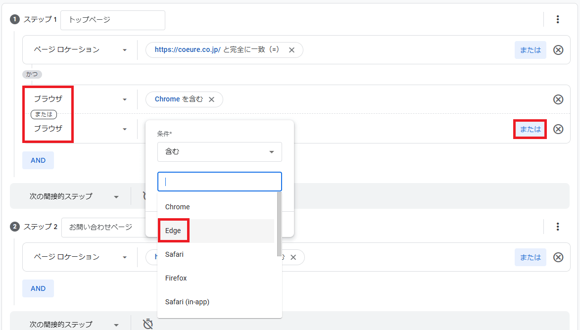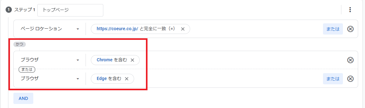 こうすることで,トップページに訪れたユーザー,「かつ」ブラウザのChrome「または」Edgeを介して閲覧したユーザーに絞り込むことができます。