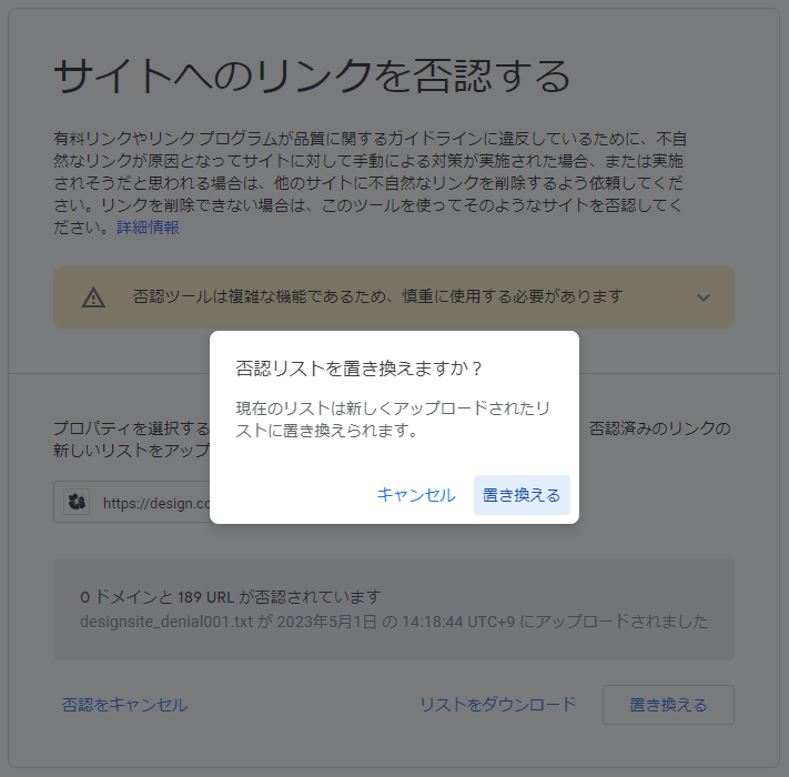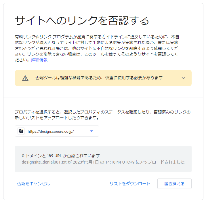 URLでのリンク否認後に,ドメインでの否認リストに「置き換える」ことができます。