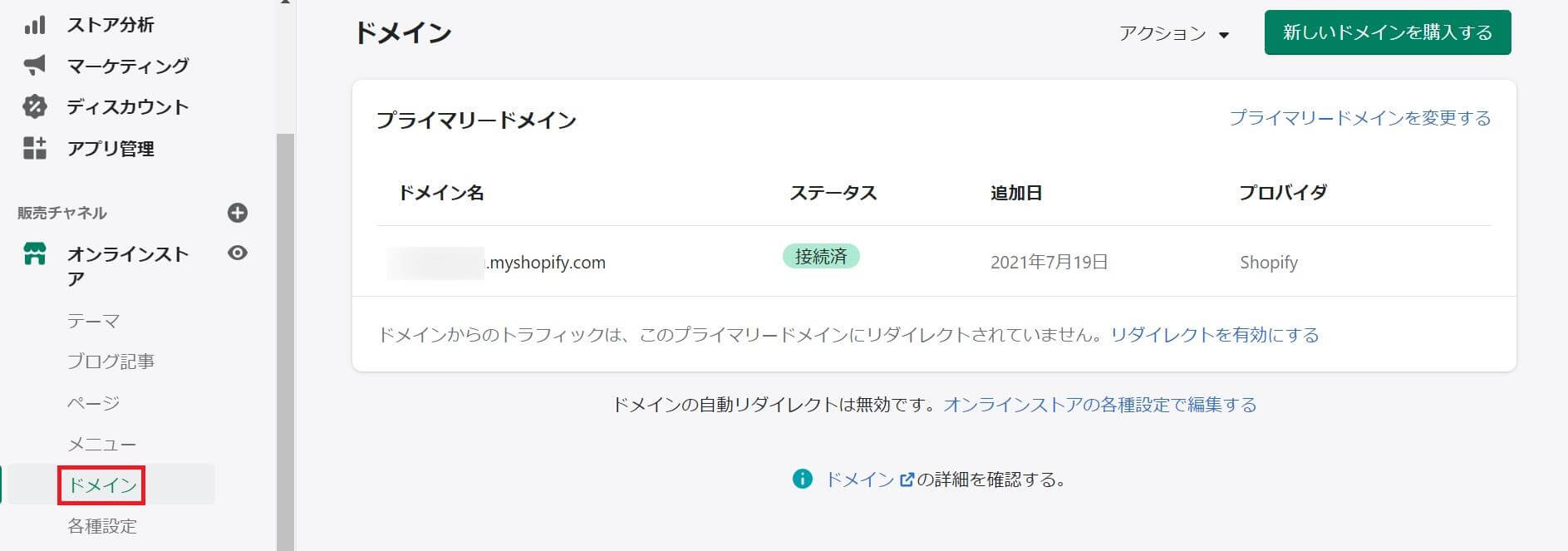 ここでドメイン設定ができます。最初は登録時に設定した○○.myshopify.comの無料ドメインが割り当てられています。独自ドメインを利用してショップを構築していきたい場合、ここで設定できます。