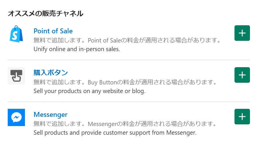 メニュー「販売チャネル」の右横にある+マークをクリックすると、「販売チャネルを追加」できるようになります。