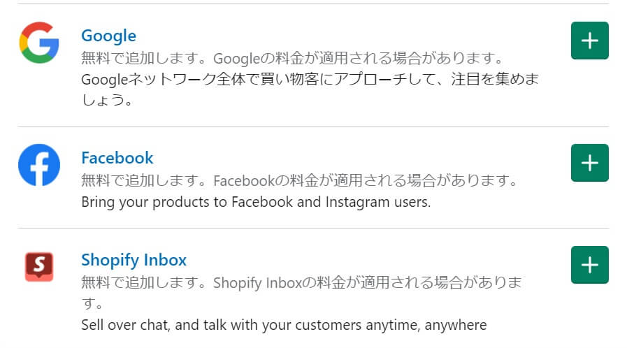 Google、facebook、楽天市場などでもチャネルを追加して販売が可能です。