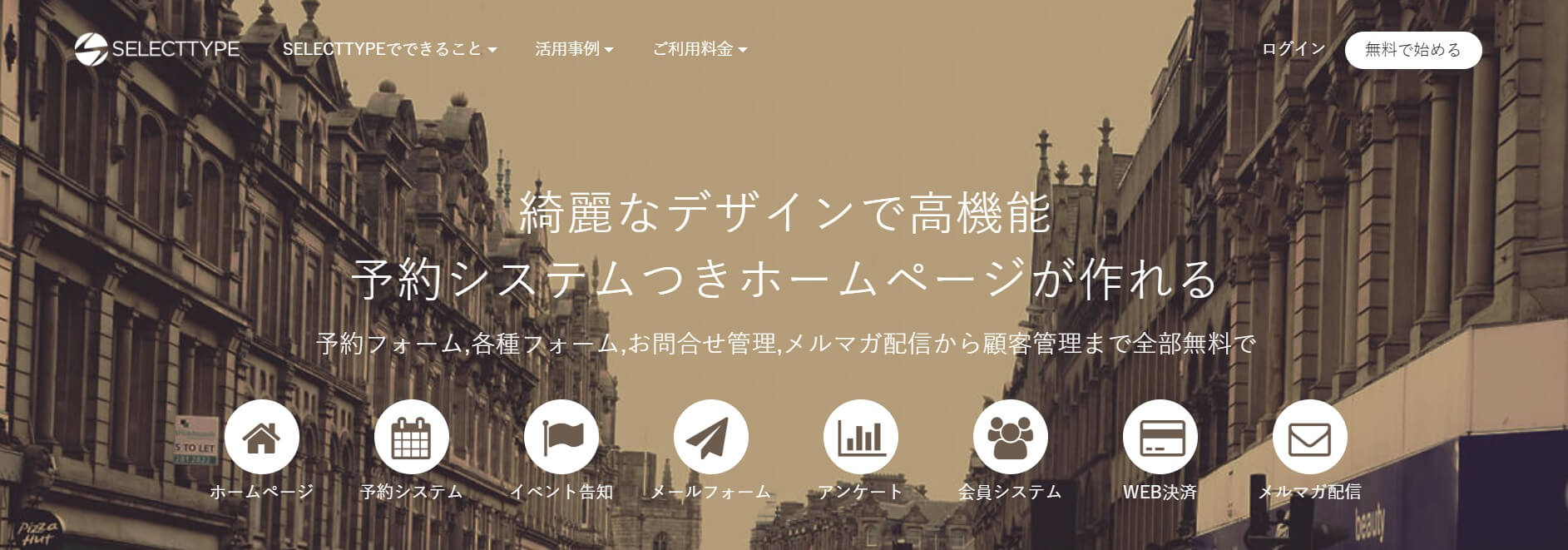 SELECTTYPE(セレクトタイプ)は、ホームページ作成ツールで予約フォームも作成できるサービスです。既存のホームページがあれば、予約フォームだけを利用することも可能です。テンプレートから予約フォームをかんたん作成して、予約管理できるのが特徴的です。