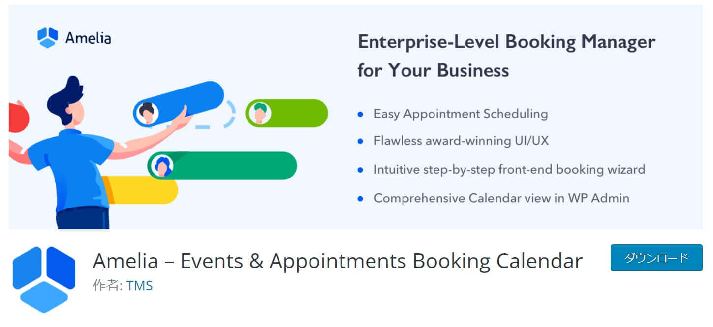 Amelia(アメリア)は、かんたんに予約システムを導入できるプラグインです。無料版でも多機能で使いやすいですが、多機能だからこそ設定にはある程度の知識が必要です。カレンダー、イベントの両タイプに対応しています。有料版では決済機能を追加できたり、Googleカレンダーと同期できます。ホテルなど日をまたぐ宿泊予約には対応していません。