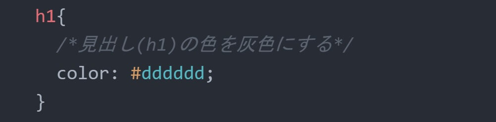 CSSの場合は、/* */ の間に記述します。こうしておけば、このCSSは「見出し(h1)の色を灰色にする」ために書いたCSSだなということがすぐにわかります。これはサイトには表示されません。