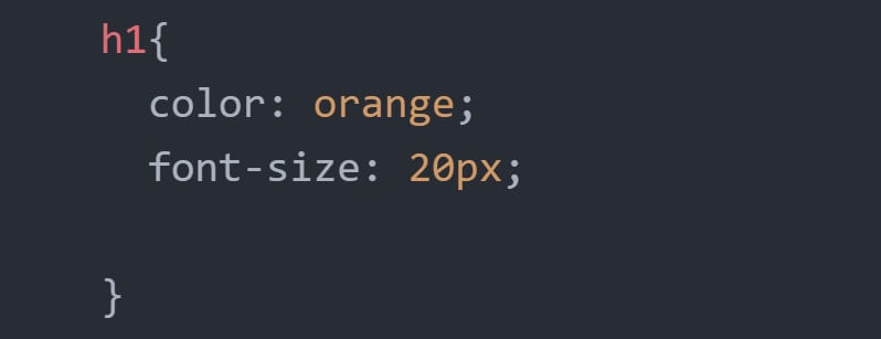 画像のように記述すれば、HTMLのh1見出しである「プログラミング基礎講座」の色はオレンジ、文字の大きさは20pxで表示されます。