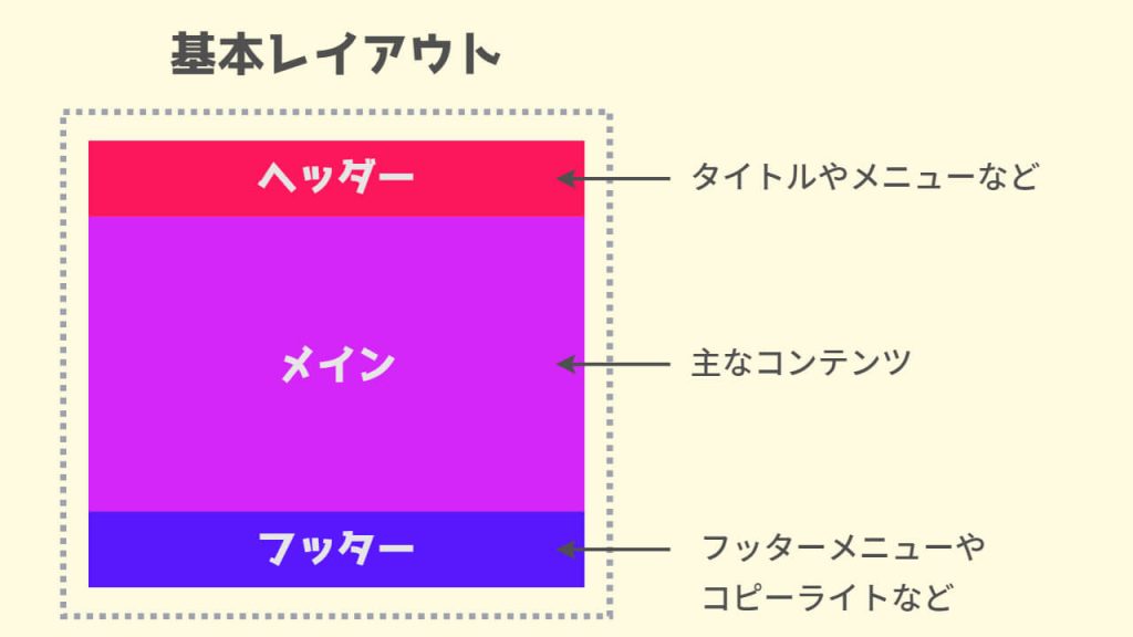 レイアウトは<div>要素を使って作っていきます。divとはdivisionの略で、このタグで囲まれた部分をひとまとまりの要素としてグループ化できます。