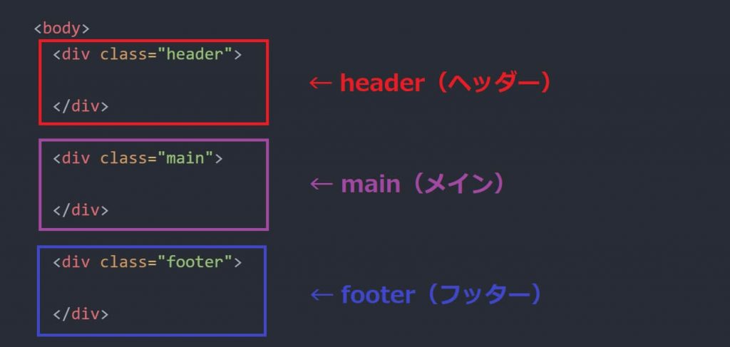 しかし、実際には特定の部分だけにスタイルを適用したいということのほうが多いです。そうした場合にclassを使うと便利です。特定の要素にclassで名前を付け、その名前が付けられている部分だけにCSSのスタイルを適用していくイメージです。今回のレイアウトで考えると、div要素で囲むヘッダー、メイン、フッターごとにCSSを適用できるようになるというわけです。