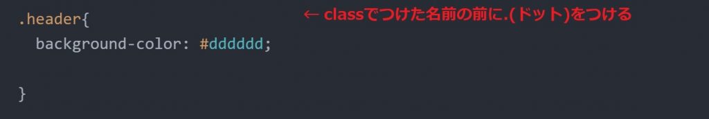 .(ドット)をつけてclass名を記述し、その後、{ } で囲んでスタイルを指定します。画像の場合、class名「header」に対し背景色を灰色(#dddddd)に指定するための記述です。